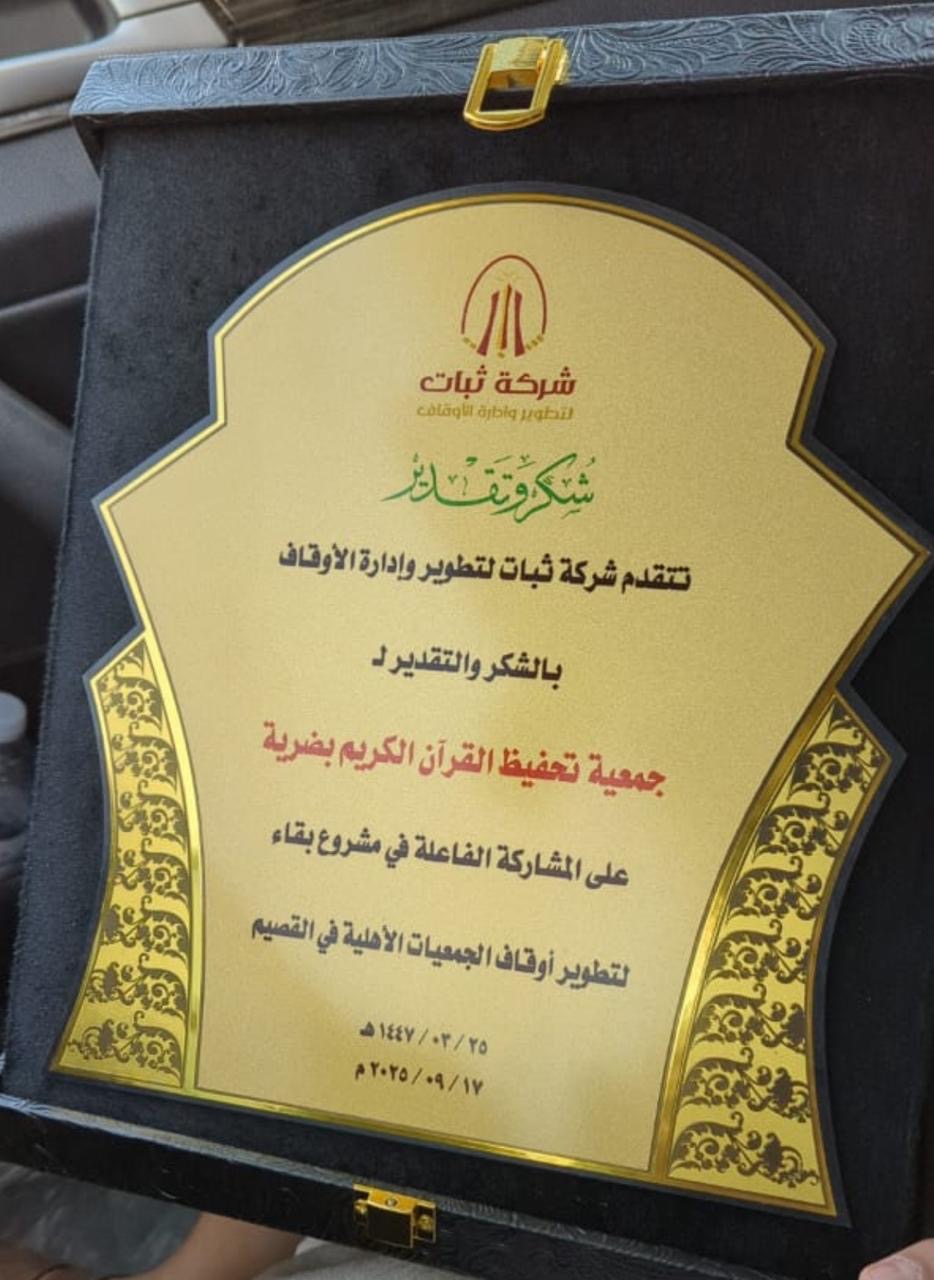 تلقت الجمعية الخيرية لتحفيظ القرآن الكريم بمحافظة ضرية شكر وتقدير من شركة ثبات لتطوير وإدارة الأوقاف ‏بمناسبة المشاركة الفاعلة في مشروع بقاء لتطوير أوقاف الجمعيات الأهلية في القصيم